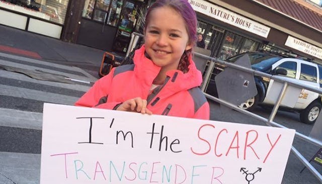 Scary Mommy had a chance to speak with Bruesehoff and she tells the story of how the sign her daughter held in the photo came to be. “She thought the sign was funny, because she’s not scary at all. It seems to have hit a nerve! People have so many misconceptions about transgender people, young and old. Transgender people are not a threat. In fact, they are the vulnerable ones. They need protection from discrimination, bullying and hate. Transgender rights are absolutely human rights.”