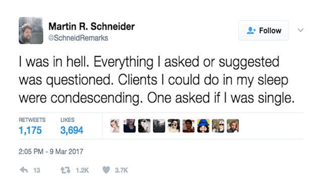 If you think workplace sexism doesn’t exist, allow this man’s story to change your mind. Since we only listen to men about this stuff anyway, it’s a good thing he’s telling it.