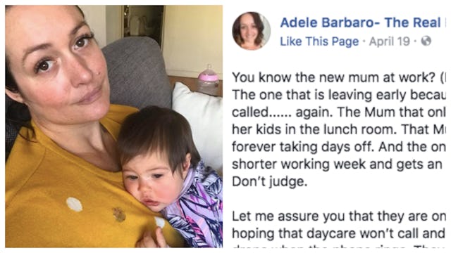 “You know the new mum at work? (Insert eye roll.) The one that is leaving early because daycare has called…… again,” Adele Barbaro writes on her Facebook page. “The Mum that only talks about her kids in the lunchroom. That Mum who is forever taking days off. And the one, that has a shorter working week and gets an extra day off? Don’t judge.”