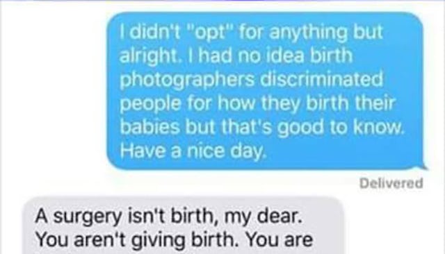 This appears to be the tail end of a convo in which a birth photographer has dumped her client because she has to have a c-section. She must have accused her of “opting” for a c-section, since her client insists, “I didn’t opt for anything.” She continues, “I had no idea birth photographers discriminated [against] people for how they birth their babies.” Neither did we.