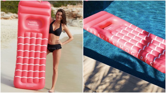 The Bravissimo Lilo (the British term for pool lounger) is a float that has built-in “cup holders” (amazing) for your boobs, so you can float to your heart’s content while tanning your backside and not choking to death on your cans.
