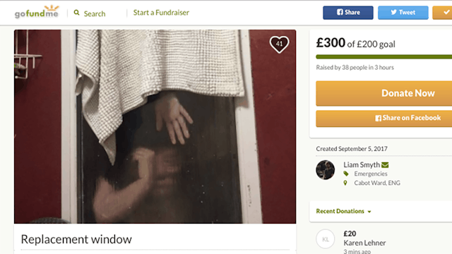 If he manages to raise more money than he needs to fix his window, he is pledging it to charities. “First, toilet twinning, a charity building and maintaining flushing toilets in the developing world. 60% of people worldwide don’t have access to a flushing toilet, which, when you think about it, really is pretty shit,” he says.