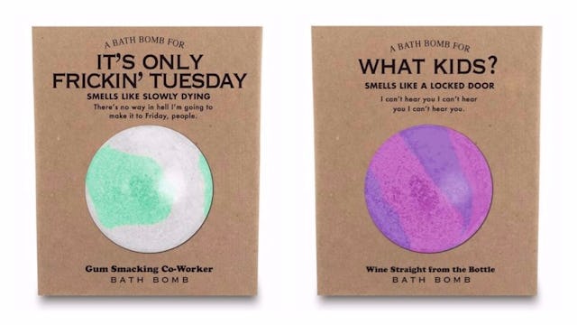 Then there’s our personal fave, the bath bomb called “What kids?” which “smells like a locked door.” Because every parent deserves some goddamn peace and quiet.