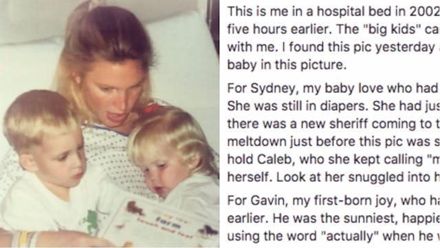 She writes, “This is me in a hospital bed in 2002 having delivered my third baby Caleb five hours earlier. The ‘big kids’ came to meet him and crawled in bed with me. I found this pic yesterday and shed tears upon tears for every baby in this picture.”
