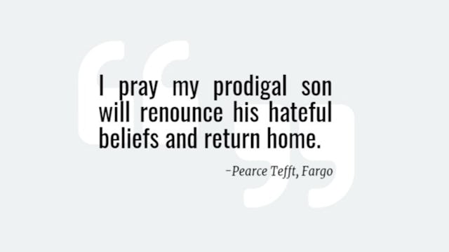 Pearce disowns his son, but expresses hope that one day, he may have a change of heart. “Peter Tefft, my son, is not welcome at our family gatherings any longer. I pray my prodigal son will renounce his hateful beliefs and return home. Then and only then will I lay out the feast.”