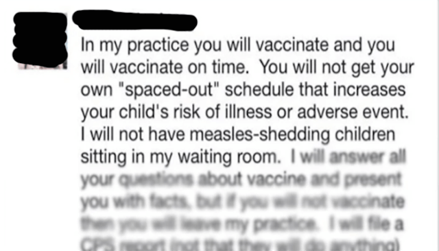 “In my practice you will vaccinate and you will vaccinate on time,” his post begins. “You will not get your own ‘spaced out’ schedule that increases your child’s risk of illness or adverse event. I will not have measles-shedding children sitting in my waiting room.”