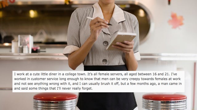 Reddit user alymday shared her story of being sexually harassed at work on the r/TwoXChromosomes subreddit. She works at a diner in a college town and says the servers are young women between the ages of 16-21. That’s what makes her story about a man who frequents the diner especially disturbing — and her boss’s reaction especially incredible.