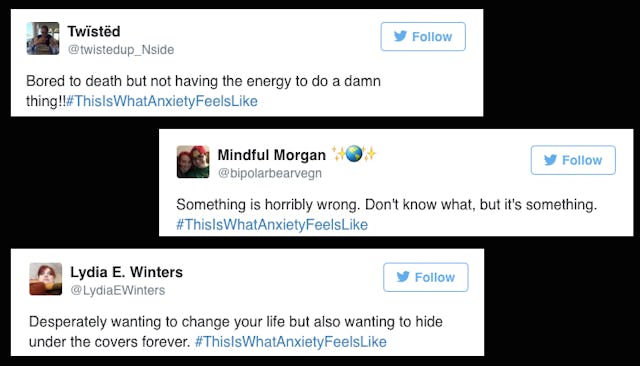 One day when she was suffering with a bout of anxiety, she decided to take to Twitter “to open the floor up for other people to share their stories about what anxiety feels like to them.” #ThisIsWhatAnxietyFeelsLike was born.