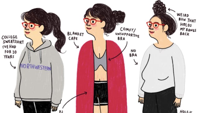 Feder tells Scary Mommy the inspiration behind her recent cartoons is her own work-at-home lifestyle. “I just drew what I actually wear when I work, so it’s been such a treat to hear how many people share my glamorous fashion sense.” She says it’s easy to feel isolated when you’re at home, so “it’s fun to imagine all of us in our weird buns and ill-fitting sweatpants getting stuff done.”