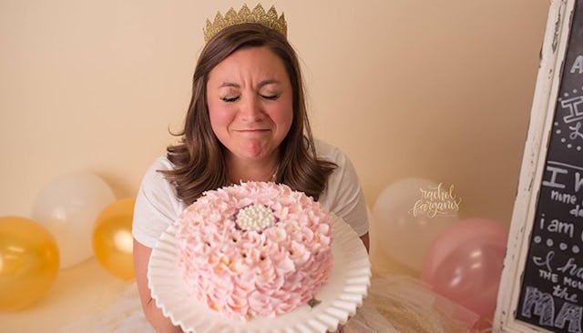 Farganis has tons of experience shooting baby cake smash photos. She told Scary Mommy that while this is her first 40-year-old cake smash, the earlier photo shoots helped. “The experience of working with one-year-olds definitely helped when directing her what to do, though,” she said. “I tried to mirror the fun that comes along with placing a kid in front of a cake and letting them go to town on it.”