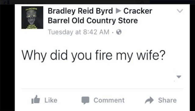 According to KJRH News, Bradley Byrd claims his wife Nanette was fired from the Cracker Barrel in Corydon, Indiana on his birthday. He posed the question to the company’s Facebook page: