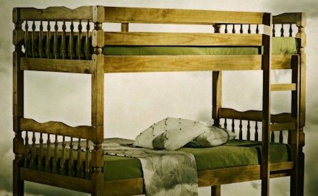 Sure, bunk beds look all cozy and idyllic. Two kids, one bed, sleeping in harmony. Whispering ghost stories late at night, swapping between top and bottom bunk, saving space in a crowded room. It all sounds so perfect. But it’s not. It’s hell.