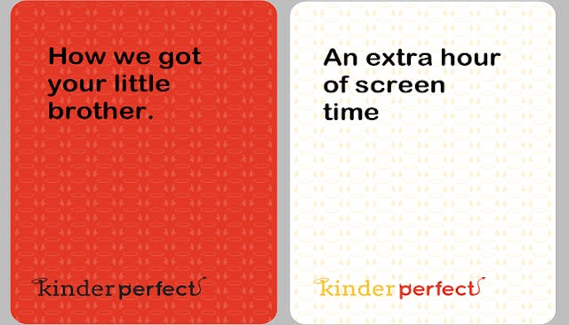 According to Huffington Post, parents Wayan and Amy Vota loved playing Cards Against Humanity (CAH) but wanted a game that reflected where they’re at in life as the mom and dad of two young daughters. And so, KinderPerfect was born; a game designed just like CAH, except you can play a card that says “baby farts,” which is pretty fantastic.
