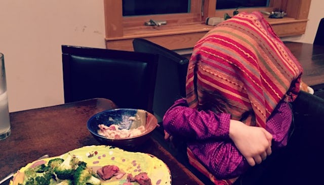 I’ve tried a lot of things to get her to eat dinner — pleading, bribing, crying, hollering, wishing upon a star, invoking Daniel Tiger songs. The child literally does not care about food. You could have her very favorite dessert sitting right in front of her, but if she has made up her mind that she isn’t going to try the casserole, it’s just not happening — ever. If hell were to freeze over, she’d still be sitting at the dinner table with her napkin over her head.