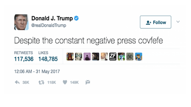 We’re used to Trump typos, they happen all the time. One even showed up on his official inauguration poster. But “covfefe?” That was just too good to ignore. And the internet didn’t. Minutes after the tweet went up, the Twitter account for the news station Fusion began responding, and this hilarity ensued: