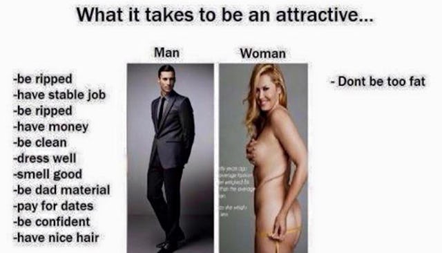 Instead of writing thoughtful articles or heartfelt columns that might better explain the men’s rights movement, the meninism clan communicates mostly in misspelled and inaccurate memes on Reddit and a Facebook page titled Meninist, which is where the post was originally shared. It says that for men to be considered attractive, they must be ripped, clean and possess nice hair, a stable job, and money. But women, those lucky bitches, are considered attractive if they aren’t “too fat.”