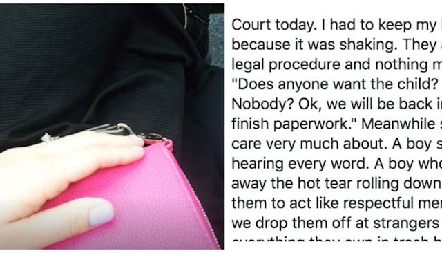 “Court today,” she began the post. “I had to keep my hand on something because it was shaking. They all spoke like it was a legal procedure and nothing more. No compassion. ‘Does anyone want the child? Are you sure? Nobody? Ok, we will be back in a few weeks and finish paperwork.’”
