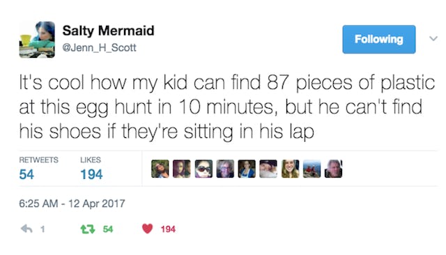 We go to the terrifying egg hunts. We fill the baskets with too much candy and then wonder why our kids are climbing the walls. We take them to get photos with some creep in a bunny suit that will haunt our nightmares until August and then we get to clean up Easter grass until there’s snow on the ground again. We do it all out of love, and luckily, the funny parents of Twitter manage to make it funny.