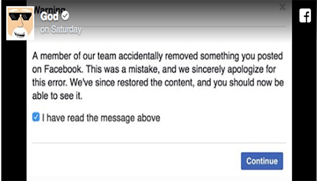 “Today I was notified by FB that My Account has been restored! THANK YOU, HUMANS! I am sure that the huge response from you yesterday was the difference in achieving this so quickly,” God wrote.