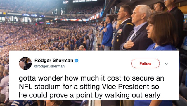 It should’ve come as no surprise to the Vice President that some players would kneel during the anthem, just as others continue to link arms in solidarity after Trump proclaimed that any “son of a bitch” disrespecting the flag should be thrown out of the stadium.