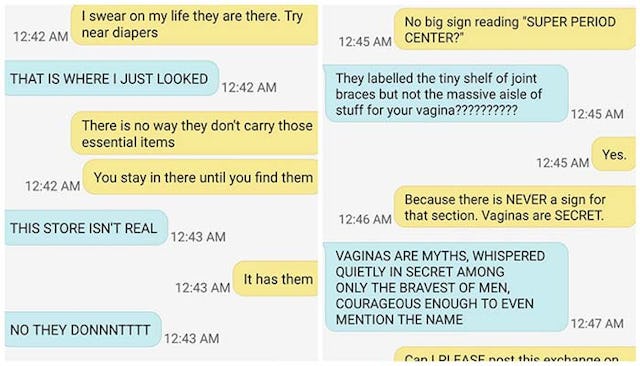 Belinda Hankins of the blog Ninja Poodles posted an epic text exchange over the weekend, that detailed helping her 13-year-old daughter navigate the store and find some pads. It’s going wildly viral, for so many reasons.