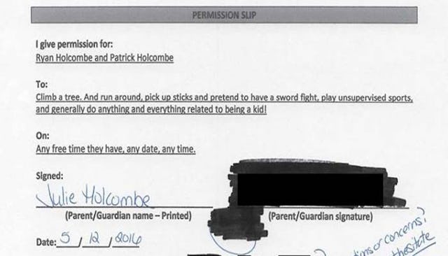 If your eyes are spinning in their sockets while reading this, imagine how Julie felt. So she penned an letter to school officials, complete with a “permission slip” allowing her boys to play outside after school. She then posted it all on her Facebook page. Consider this the greatest parental clapback and mic drop of all time.