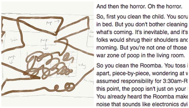 “When your four-year-old gets up at 3am to crawl into your bed, you’ll wonder why he smells like dog poop. And you’ll walk into the living room. And you’ll wonder why the floor feels slightly gritty. And you’ll see a brown-encrusted, vaguely Roomba-shaped thing sitting in the middle of the floor with a glowing green light, like everything’s okay. Like it’s proud of itself. You were still half-asleep until this point, but now you wake up pretty damn quickly.”