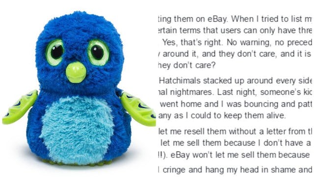 Turns out, both eBay and Amazon were not willing to play in Gruen’s journey of depriving small children of Christmas joy (or forcing their parents to pay hundreds of dollars for it). The author laments that eBay only allows a user to sell three Hatchimals per week and Amazon requires a letter from the manufacturer in order to sell that many. She’s upset that eBay wasn’t having any of her complaining. “No warning, no precedent, nothing. And there is no way around it, and they don’t care, and it is unprecedented, and did I mention they don’t care?”