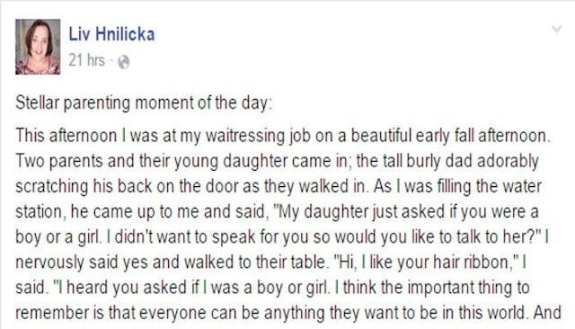Liv Hnilicka is a transgender waitress from Minneapolis who was at work recently when she experienced what she calls a “stellar parenting moment.” A family came into the restaurant with their little girl and the child asked her dad if Hnilicka was a boy or a girl. Unsure of how Hnilicka chooses to identify herself, the father did something spectacular and decided to let her answer the question for herself.