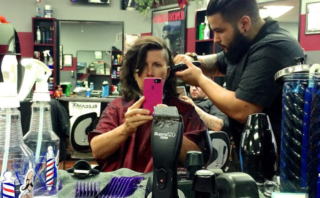 You know how once you venture into the previously unknown it opens up into a whole new world? I started asking around about getting designs shaved into my undercut. Perhaps a floral pattern, my business logo, the possibilities were endless. Rebecca said I needed to find a barbershop with a “Z” in the name, such as Fadz and Bladz, which were often in rough neighborhoods. That took the wind out of my sails. While on vacation this summer, I happened to pass a place called “Jagged Edge.” No Zs, but in the windows were claims that they could do fades and graphics. I went home and called. “Do you cut women’s hair?”