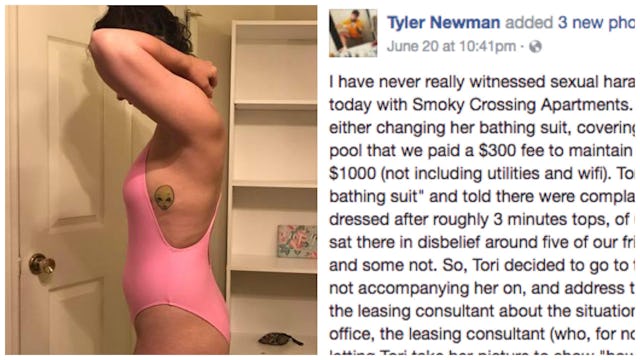 “Today my fiancée was faced with either changing her bathing suit, covering up with shorts, or leaving the pool that we paid a $300 fee to maintain on top of a monthly rent of nearly $1000,” Newman writes. “Tori was accused of wearing a “thong bathing suit” and told there were complaints about the way she was dressed after roughly 3 minutes tops, of us arriving there. ”