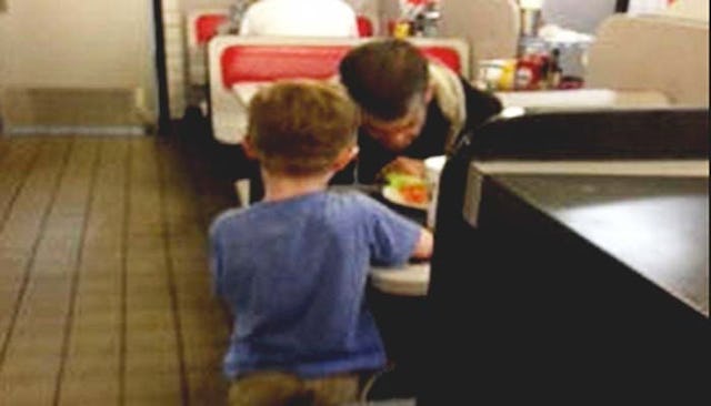 Since no one had acknowledged the homeless man, Josiah brought him a menu and asked him what he wanted. Faulk bought the man a burger, and before he ate it Josiah asked if he could say a blessing: