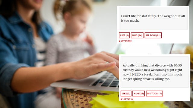 “Actually thinking that divorce with 50/50 custody would be a welcoming sight right now. I NEED a break. I can’t do this much longer spring break is killing me,” says one parent in the Scary Mommy Confessional. Obviously, they not willing to divorce over it (or maybe they are?), but being home with children all day, every day, caring for every need 24/7, playing chef and arbitrator, maid and valet, plus on-board entertainment is damn exhausting.
