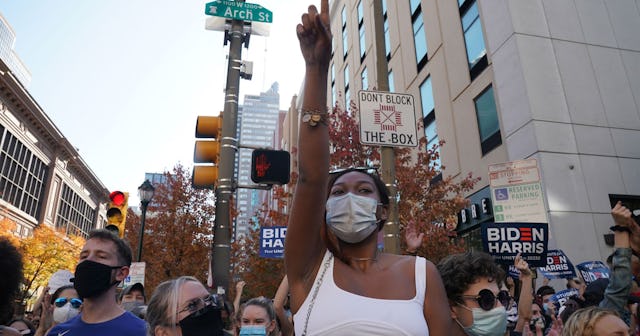 The country patiently watched Pennsylvania all week as they counted the votes, with Pennsylvania’s mail-in voters finally giving Biden the electoral edge he needed, so naturally, Biden supporters flocked to Philadelphia to celebrate. Note all the masks, because Biden supports know what’s up when it comes to COVID safety.