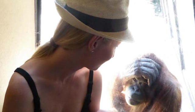 What happened next is pretty cool. An orangutan settled on the opposite side of the glass and watched the mother feed her child, Eli. “I took him into a quiet corner away from the crowd to feed, then this happened,” explains Burrett on her Facebook page. “This mummy came to investigate and she watched the whole feed. It was the most beautiful thing!!!”