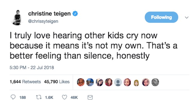 Chrissy Teigen nails the unexpected joy of hearing another parent’s kid crying