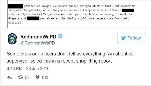 The Redmond PD then shared an image of part of the report and tweeted, “Sometimes our officers don’t tell us everything. An attentive supervisor spied this in a recent shoplifting report.”