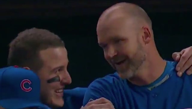 As if the Cubs win last night wasn’t magical enough for its come-from-behind story of redemption, it was the tiny moments in the game that really captured our hearts – like this one when Cubs slugger Anthony Rizzo admits to feeling like an emotional basket case. With the Cubs leading in the fifth inning, Anthony Rizzo put his arm around veteran David Ross and said, “I can’t control myself right now. I’m trying my best.”