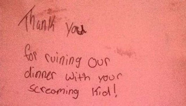 Leach says about halfway through their meal, two women from the table next to hers walked up, slammed the above note down on the table, then walked back to where they were seated and resumed their dinner. Excuse me, what? Am I alone in thinking this is some odd behavior? If you’re going to walk all the way up to another table, why not just speak?