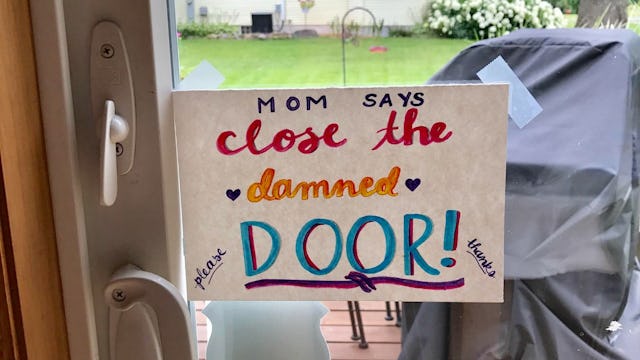 Sick and tired of repeating myself over and over and over again, I put my newfound interest in hand-lettering to work. I crafted a beautiful, double-sided sign and taped it up right by the handle of the sliding door. The side facing out reads “Keep door closed.” The side facing in says “Mom says close the damned door.”