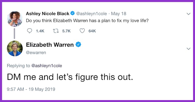 Presidential hopeful Elizabeth Warren hopped on Twitter to help comedian Ashley Nicole Black get her dating life back on track