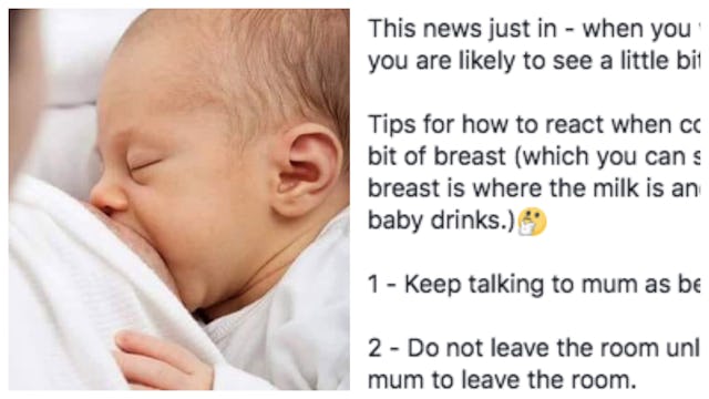 “This news just in — when you visit a breastfed baby, you are likely to see a little bit of breast,” the post starts. Then it launches into tips for how people should react when confronted with the sight of a “tiny bit of breast,” because “the breast is where the milk is and the milk is what the baby drinks.”
