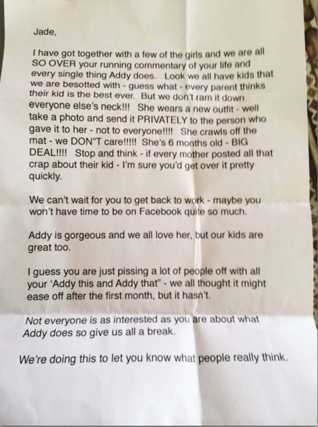 An Australian mother received an anonymous letter from some “friends” who were apparently sick and tired of seeing updates and photos about the woman’s child on Facebook. 33-year-old Jade Ruthven found the letter shoved into her mailbox over the weekend. It was unsigned — and pretty ruthless: