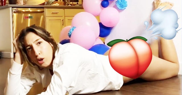 Paige Ginn, whose YouTube channel contains a lot of funny pranks and flatulence-related content, posted her gender reveal video both on that platform and on her Instagram, where it garnered nearly a million combined views. And it’s pretty easy to see why. In the video, she’s lying on the floor, pantsless, with an arch of pink and blue balloons behind her. After screwing up her face a little and clearly struggling to push it out, she lets rip a massive fart — along with a cloud of blue that shoots from her butt. Yep, that’s right. This woman literally farted out her gender reveal.