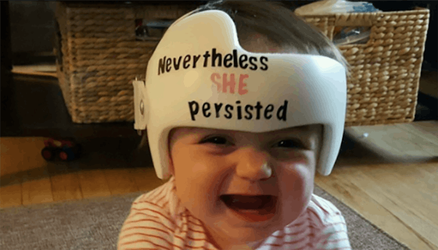 Earlier this week, a mom named Lori shared an adorable photo of her 8-month-old daughter with the Facebook group, Pantsuit Nation. In the picture, the baby wears a cranial helmet with the quote “Nevertheless she persisted” on it in craft stickers.