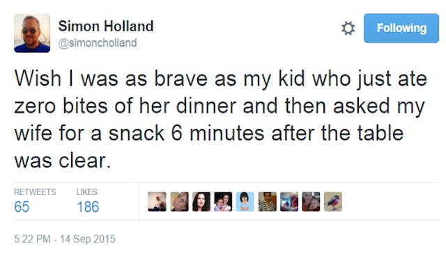 Eating with kids. The picky, whiny bullshit. The constant messes. The tense negotiations for “one more bite”. Whether it’s at home or a restaurant, feeding your kids involves a huge set of potential challenges. Trying to get enough nutrients in them to survive can be incredibly stressful when they fight you at every turn and this topic is rightly fraught with stress and worry. However, it’s also full of moments where looking back, it’s maybe just a little bit funny. That’s what the parents of Twitter focus on in these hilarious parenting tweets about eating with kids. It may not be fun, but it sure can be funny.
