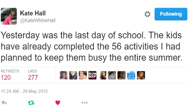 Of course, summer won’t be all bad. There’s some fun to be had. Oh God, I’m rhyming — maybe I’m already losing my shit. But those final weeks leading up to it can be a special brand of miserable for everyone. Parents are done with the constant homework and lunch packing and fund raisers, but the alternative is entertaining their kids all summer and they’re bored pretty much on day one. These last weeks of school are the ultimate in bittersweet. Luckily, the funny parents of Twitter are right there with you, chugging boxed wine and counting the days until our freedom ends.