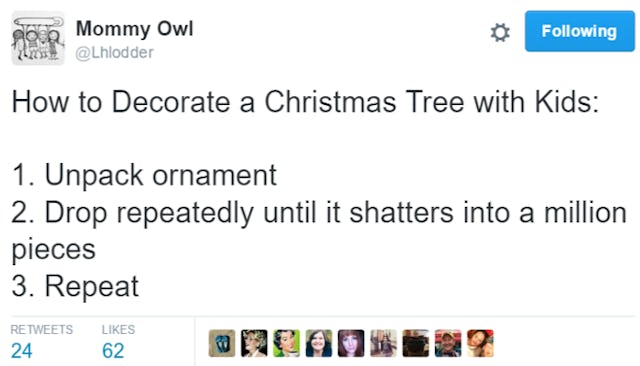 Gone are the days when you could leave a giant box of fragile ornaments out for a few hours, hanging them at your leisure while sipping wine and listening to Christmas music. Now, it’s a race to the finish with the kids climbing over each other to claim their favorites and you shrieking like a crazy person not to drop and break them. They crowd everything on one tree branch as you silently grit your teeth and try not to lose your shit. They do just about everything possible to remove all fun from the equation, but we press on — we’re parents, it’s what we do. And no one understands your holiday hell like the funny moms and dads of Twitter.