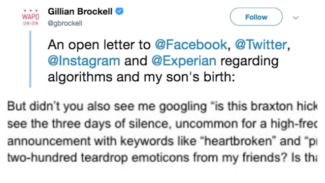 She addresses the algorithm for targeted ads directly, by saying she knows she received them while pregnant because of her own search history, social media photos, and the maternity and baby items she was shopping for. “And I bet Amazon even told you my due date, January 24th, when I created that Prime registry,” she writes. “But didn’t you also see me googling ‘braxton hicks vs. preterm labor‘ and ‘baby not moving?’ Did you not see my three days of social media silence, uncommon for a high-frequency user like me?”
