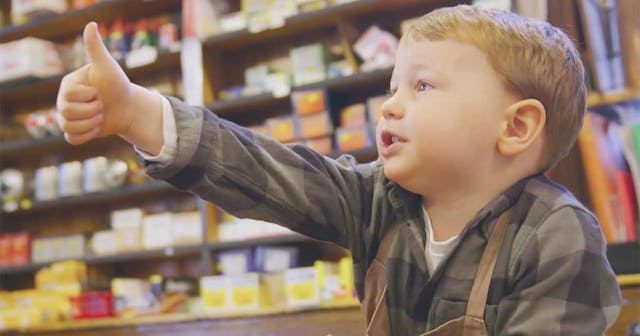 The commercial follows little Arthur, who acts like his store owner dad. He wakes up in the morning, eats his cereal, brushes his teeth, and heads to the store to open up. He does various chores throughout the day, like sweeping the floor, wiping down the cashier counter, and stocking products on shelves. He has adorable interactions with customers, like when he gives change to one and offers him a thumbs up as he heads out the door, and when he (badly) wraps a gift for another, again offering a tiny thumbs up as the customer leaves the store.